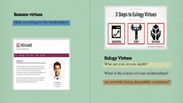 Resume virtues vs eulogy virtues. The eulogy virtues are the ones that are talked about at your funeral whether you were kind brave honest or faithful. Comments are turned off. As brooks says resume virtues are about career success and eulogy virtues are about your inner light and inner character including qualities like kindness honesty with self and with others maturity and capacity to love.